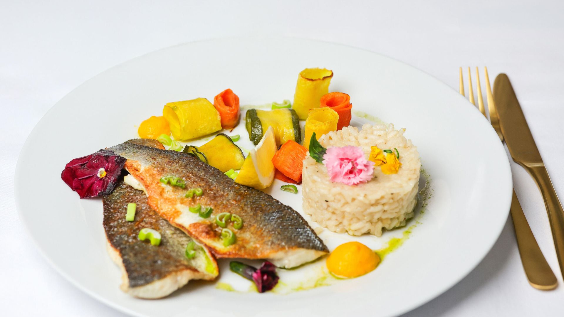 Saveurs romarin et citron, tagliatelles de 3 légumes au curcumin (carottes, navets, courgettes), risotto, mousseline de carottes à l’orange